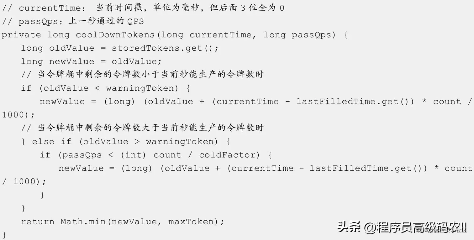 Sentinel中的resync方法与SmoothRateLimiter的resync方法不同,在Sentinel中每秒只生产一个令牌。WarmUpController的syncToken方法的源码如下。