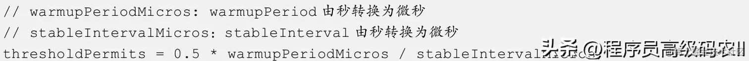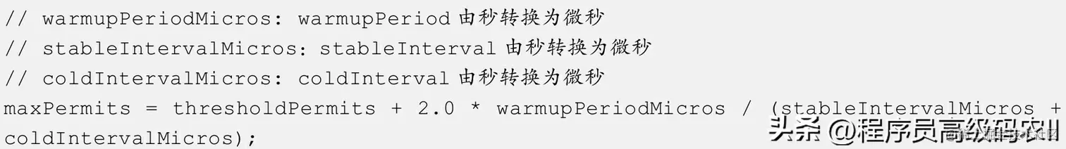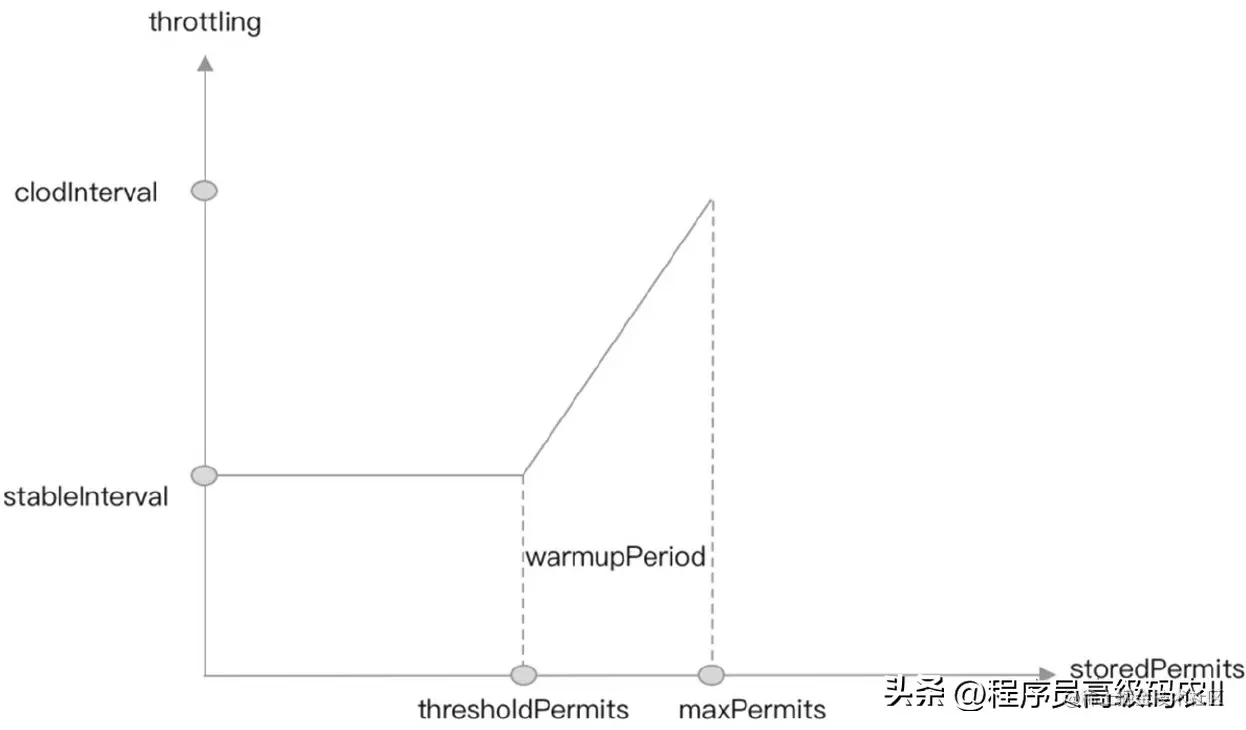 由于coldFactor等于3,且coldInterval等于stableInterval乘以coldFactor,故(coldIntervalstableInterval)是stableInterval的两倍,因此从thresholdPermits到0的时间是从maxPermits到thresholdPermits时间的一半,也就是warmupPeriod的一半。