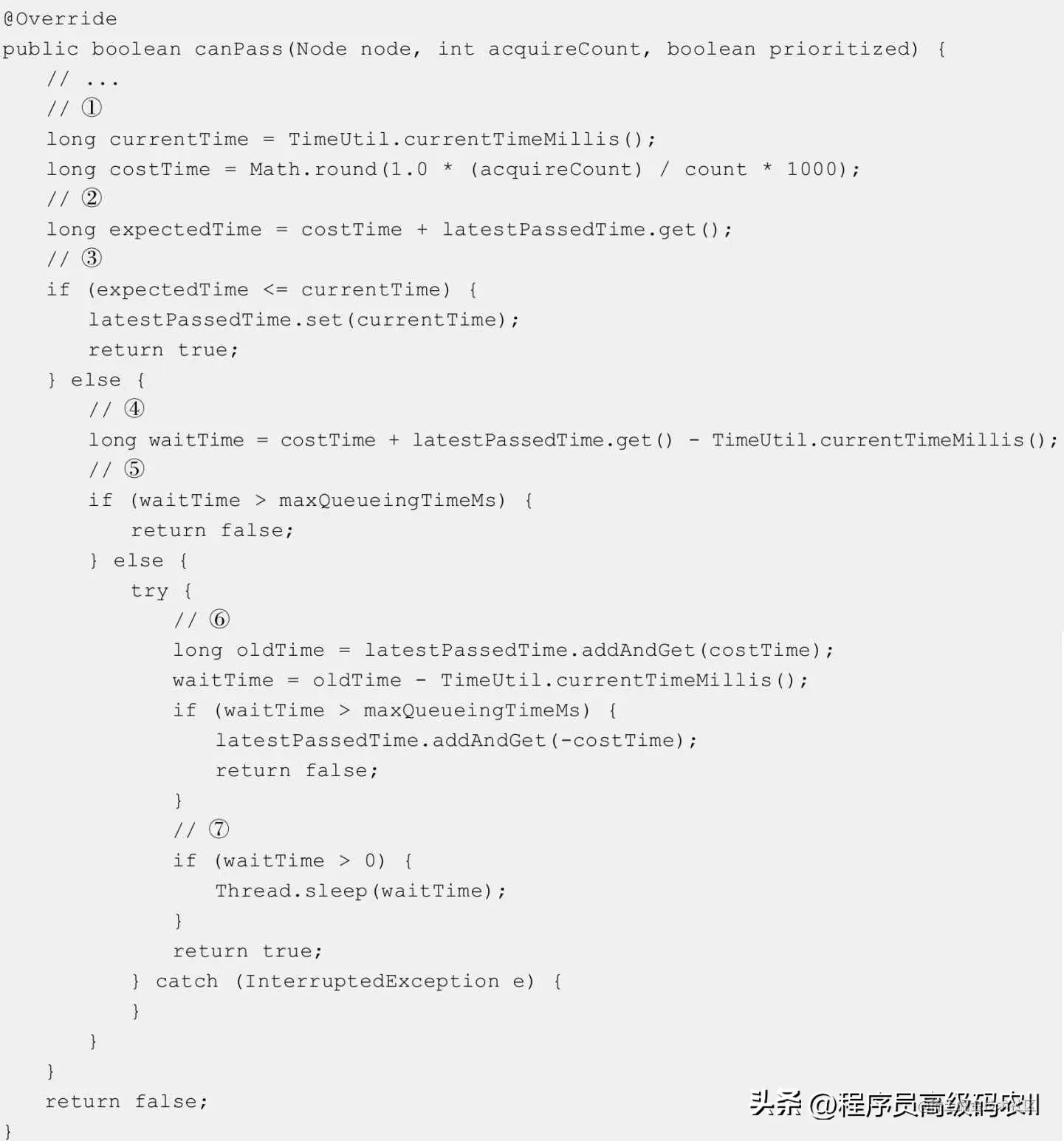 ① 计算队列中连续两个请求通过的时间间隔,如果限流阈值为200QPS,则costTime等于5,即每5毫秒只允许通过一个请求,而每5毫秒通过一个请求就是固定速率。