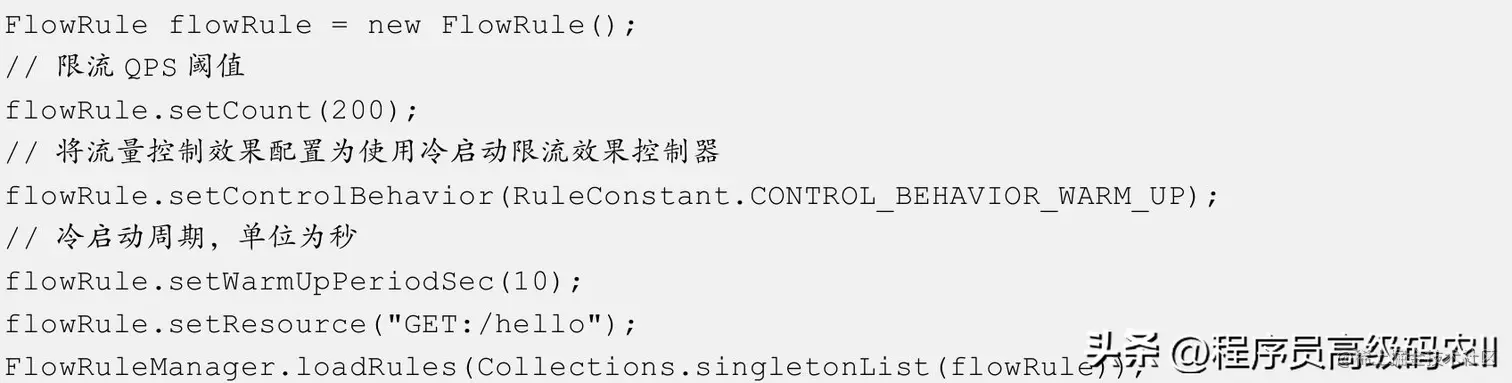 如果要使用WarmUpController,则必须将限流规则阈值类型配置为GRADE_QPS,代码如下。