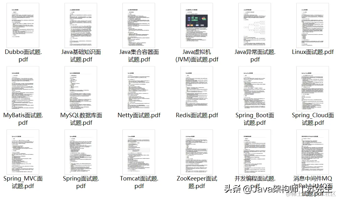 本文档是从阿里面试官整理的 Java 面试题;包含了 Java 基础、Java 集合容器、Java 异常、并发编程、JVM、Spring、Spring MVC、Spring Boot、Spring Cloud、MyBatis、Redis、MySQL 数据库、消息中间件 MQ 与 RabbitMQ、Dubbo、Linux、Tomcat、ZooKeeper、Netty、 架构设计 &分布式 &数据结构与算法等等,都是互联网大厂的面试真题,已经有粉丝靠这份 PDF 拿下众多大厂的 offer。