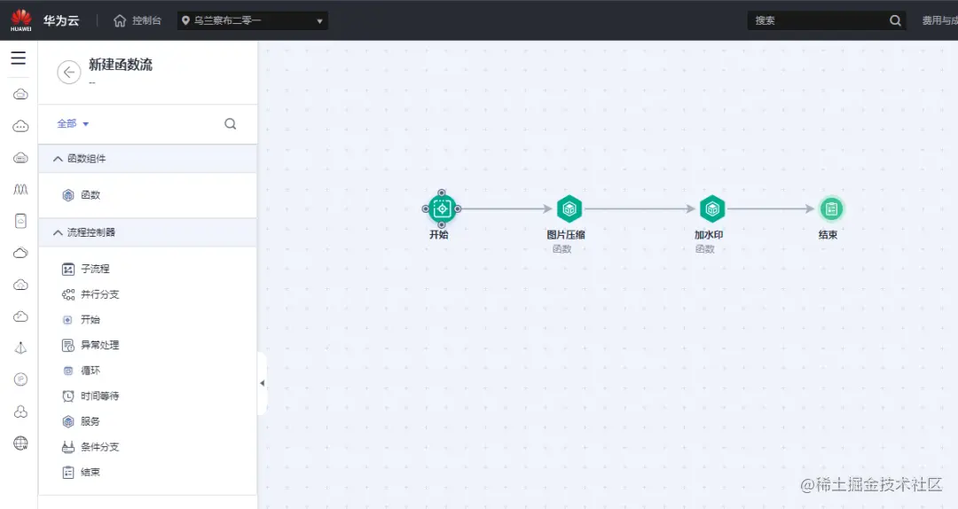 3、用上面的方式完成其他函数的编写,最后在 FunctionGraph 的函数流控制台完成工作流编排,举例如下: