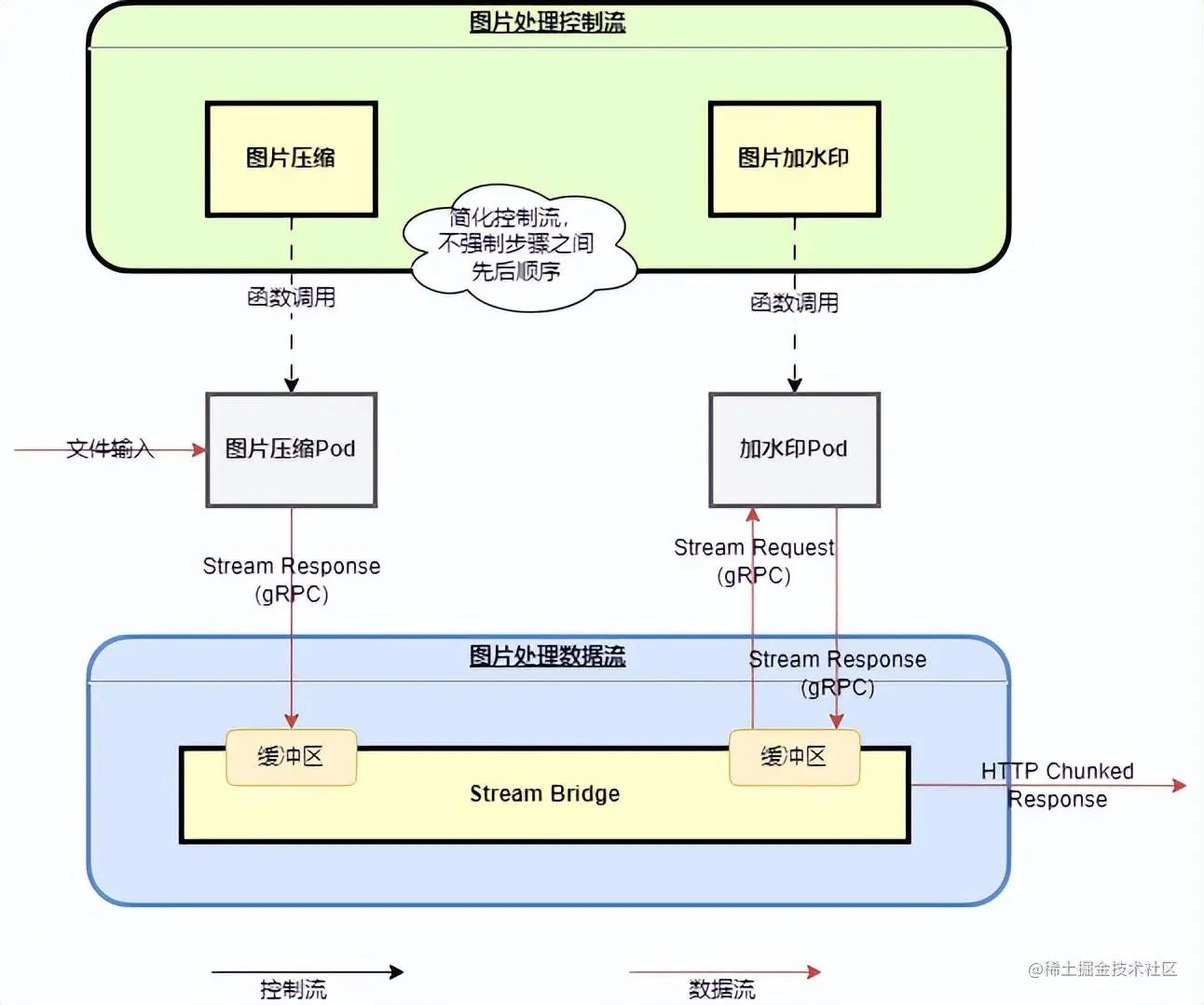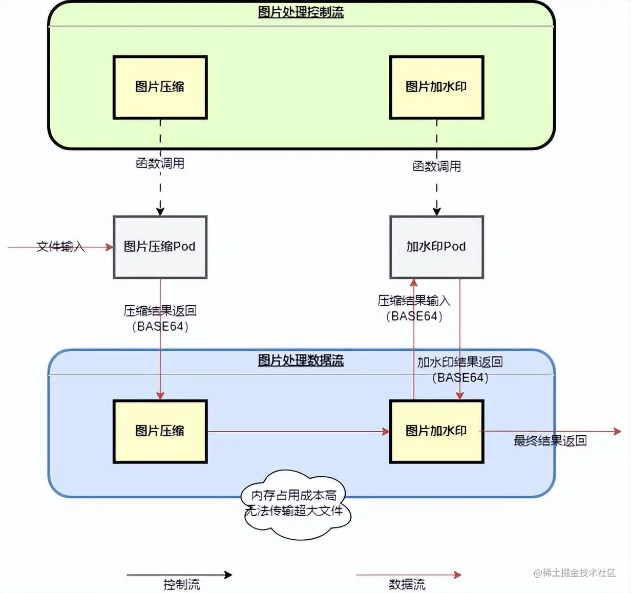 在普通的服务编排中,由于需要精准控制各个服务的执行顺序,所以控制流是工作流的核心部分。然而在文件处理等流式处理场景中,对控制流的要求并不高,以上述图片处理场景举例,可以对大图片进行分块处理,图片压缩和加水印的任务不需要严格的先后顺序,图片压缩处理完一个分块可以直接流转到下一个步骤,而不需要等待图片压缩把所有分块处理完再开始加水印的任务。