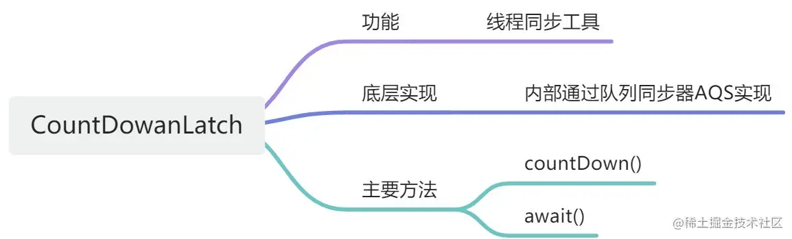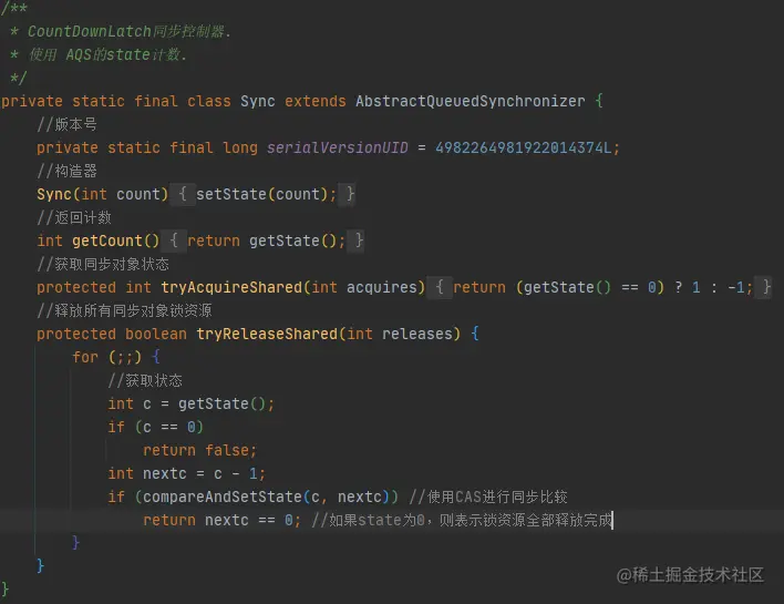 CountDownLatch内部定义了一个静态类Sync继承于队列同步器AbstractQueuedSynchronizer(简称AQS),AQS是用来构建同步锁的基本框架,它内部使用一个Int类型的state表示同步状态、,通过内置的FIFO队列来完成资源获取的线程的排队工作。