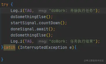 先开启子线程执行任务,但是在子线程Work的run方法中startSignal.await();挂起等待。主线程执行完第一个doSomethingElse()任务,然后调用startSignal.countDown(),释放同步锁,此时子线程得到了执行的机会。主线程调用doneSignal.await()方法阻塞当前线程,直到所有子线程执行完成。调用downSignal.countDown(),将同步锁计数减到0,主线程恢复执行。执行最后一个doSomethingElse()任务。