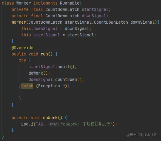 3.分别将两个CountDownLatch对象的实例传入子线程任务中。