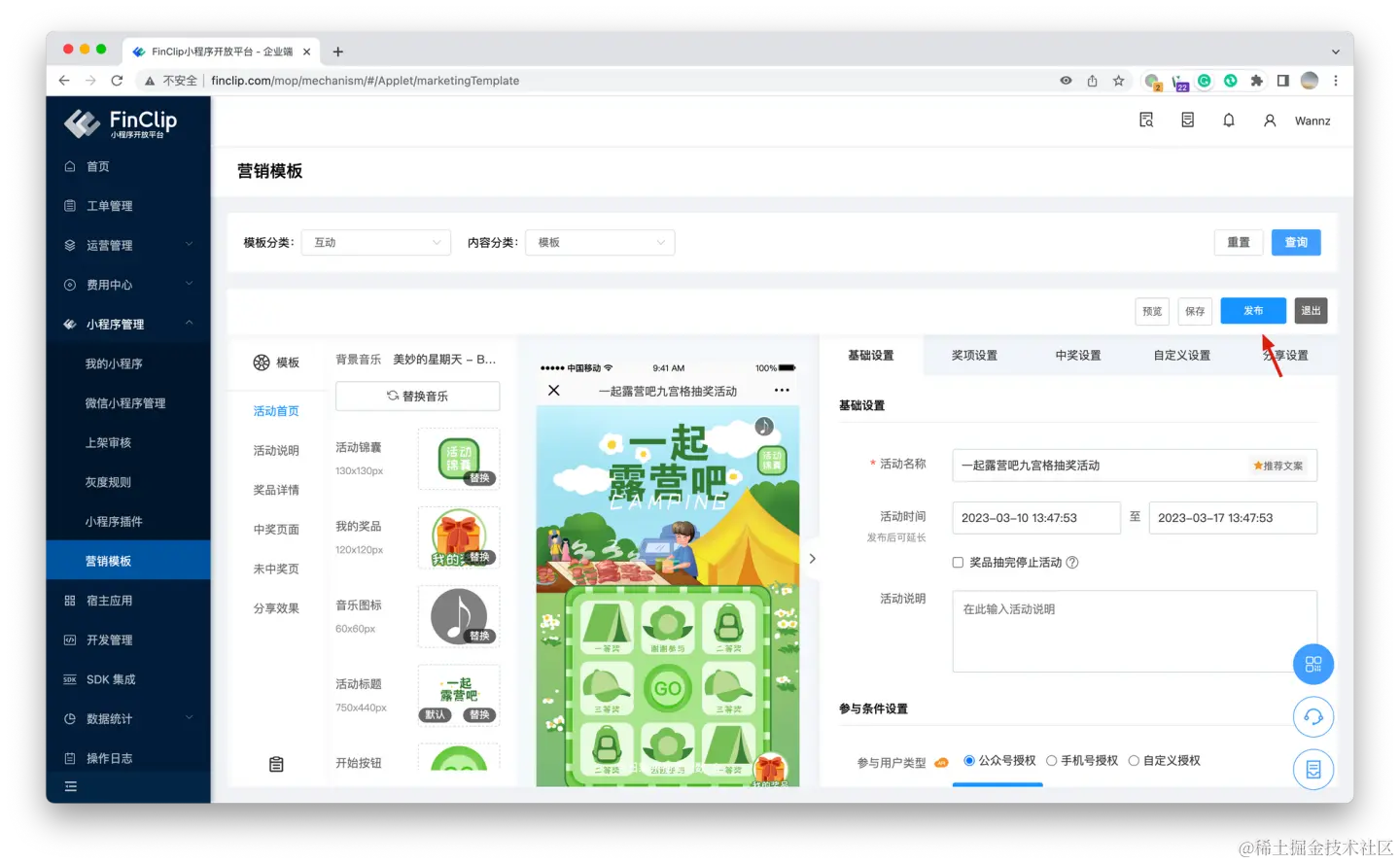 小程序开发者可以在登录小程序开放平台后,点击左侧的「小程序管理 - 营销模板」进入对应页面,并且在其中根据自己的需要,选择不同类型的营销活动页面。