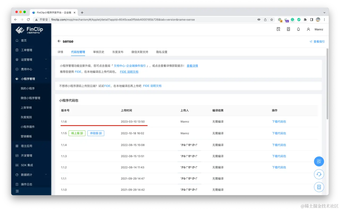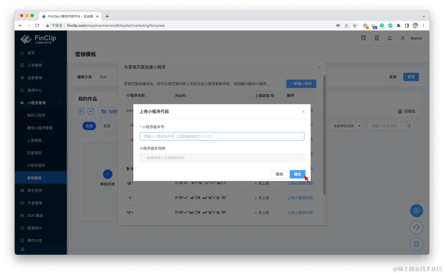 点击确认后,当前版本的营销内容即已经上传至对应小程序中,可以通过将对应的版本内容设置为体验版,线上版,或进行灰度发布。从而使小程序能够直接获得对应的营销页面能力。