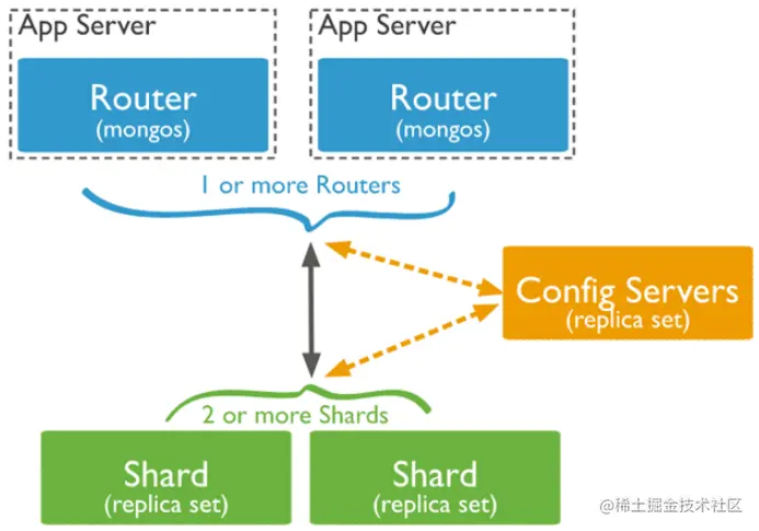 - Config Server:配置服务器,所有Shard节点的信息、分片功能的一些配置信息都存储在Config Server里,可以理解为真正数据的元数据;