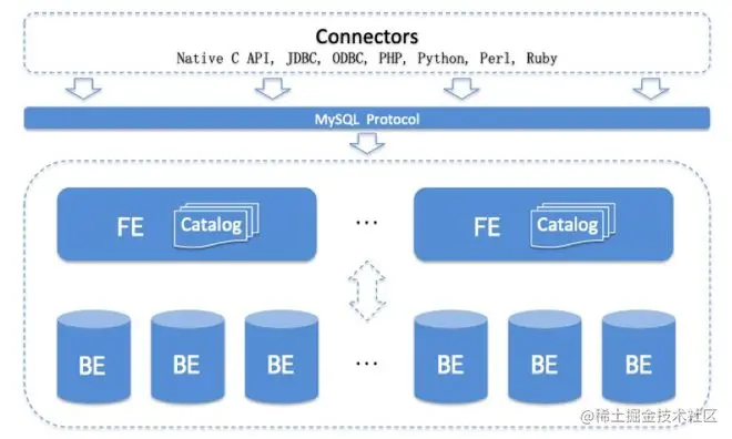 Doris的定位是面向在线报表和分析的数据仓库系统,可以对标于商业的 MPP数据仓库系统,比如 Greenplum、Vertica、Teradata等。Doris 架构如下:
