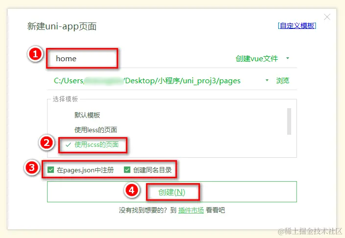 在弹出的窗口中,填写页面的名称、勾选 scss 模板之后,点击创建按钮。截图如下: