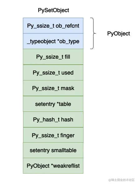 - hash,这个值对 frozenset 有用,保存计算出来的哈希值。如果你的数组很大的话,计算哈希值其实也是一个比较大的开销,因此可以将计算出来的哈希值保存下来,以便下一次求的时候可以将哈希值直接返回,这也印证了在 python 当中为什么只有 immutable 对象才能够放入到集合和字典当中,因为哈希值计算一次保存下来了,如果再加入对象对象的哈希值也会变化,这样做就会发生错误了。
