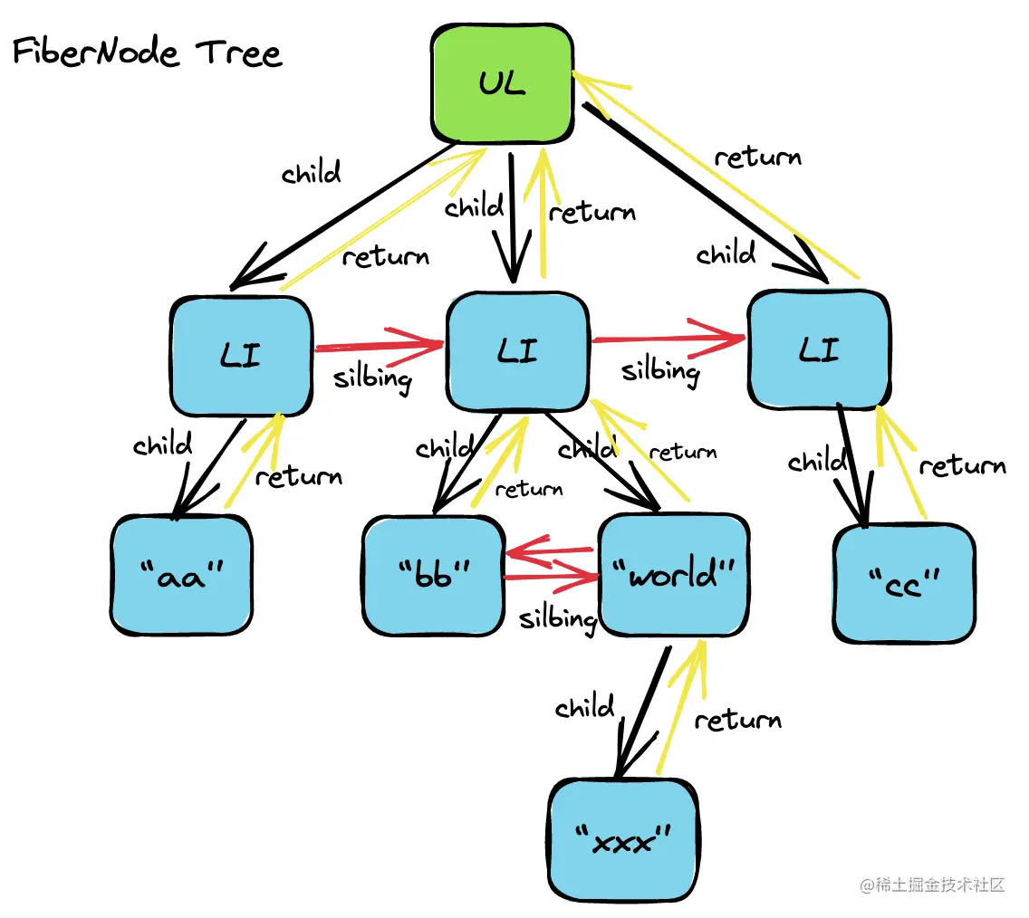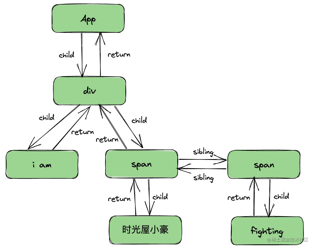 每个Fiber节点有个对应的React element,多个Fiber节点是如何连接形成树呢?靠如下三个属性: