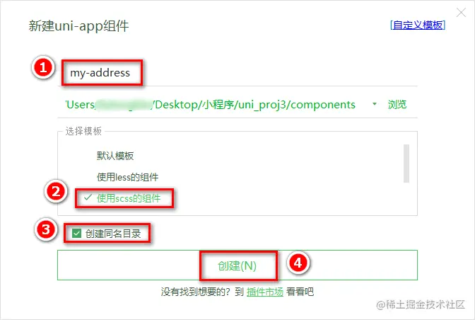 components目录上鼠标右键,选择新建组件,并填写组件相关的信息: -