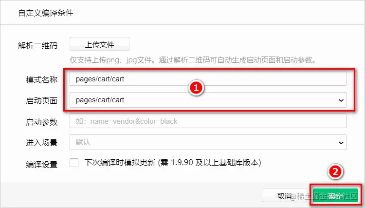 勾选“启动页面的路径”之后,点击“确定”按钮,新增购物车页面的编译模式: