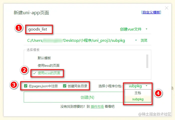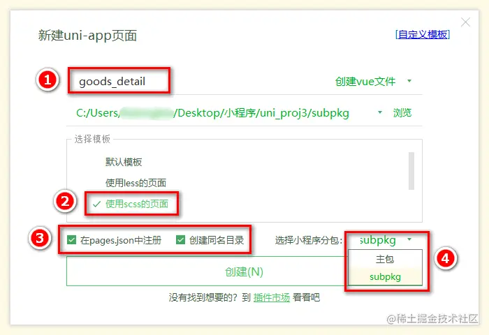 subpkg目录上鼠标右键,点击新建页面选项,并填写页面的相关信息: