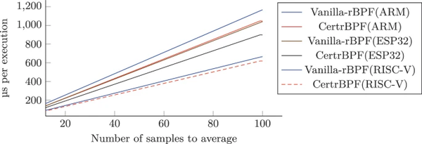 主要观点。我们观察到CertrBPF通常会减小内存占用。其中一个原因是当前RIOT API的调用尚不支持CertrBPF。我们观察到,在Cortex-M上,分支指令的执行速度减慢,如图4所示。然而,在所有其他平台(RISC-V、ESP32和Cortex-M)上,我们的微基准测试显示,与普通rBPF相比,大多数指令都具有CertrBPF加速。这种行为在我们的传感器数据处理基准测试中也可见,如图5所示,CertrBPF在三个平台上表现优于普通rBPF。总的来说,CertrBPF获得了安全性,并减少了内存占用和执行时间。
