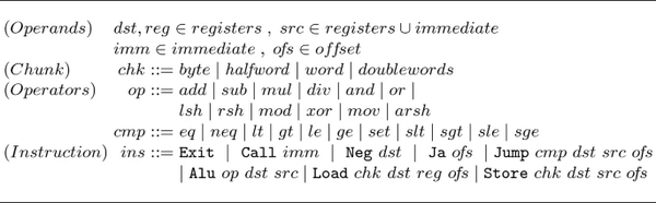 对于我们的证明模型,我们定义了rBPF的显式语法。我们还定义了解释器的状态和语义函数,特别是实现动态安全检查的函数。rBPF指令集,图2,包括二进制算术和逻辑运算、否定、相对于偏移量的(非)条件跳转、从/到寄存器/内存中加载/存储值的操作、函数调用和终止。有十一个64位寄存器{R0,…,R10};一个立即数是32位宽,一个偏移量是16位宽。