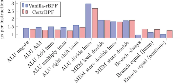 - 系统集成和微基准测试。*我们将CertrBPF集成为RIOT操作系统中当前未经验证的rBPF解释器的替代品。然后,在各种32位微控制器架构上运行的RIOT中集成CertrBPF的性能进行比较评估。我们的基准测试证明,在实践中,CertrBPF不仅具有安全性,而且减少了内存占用和执行时间。