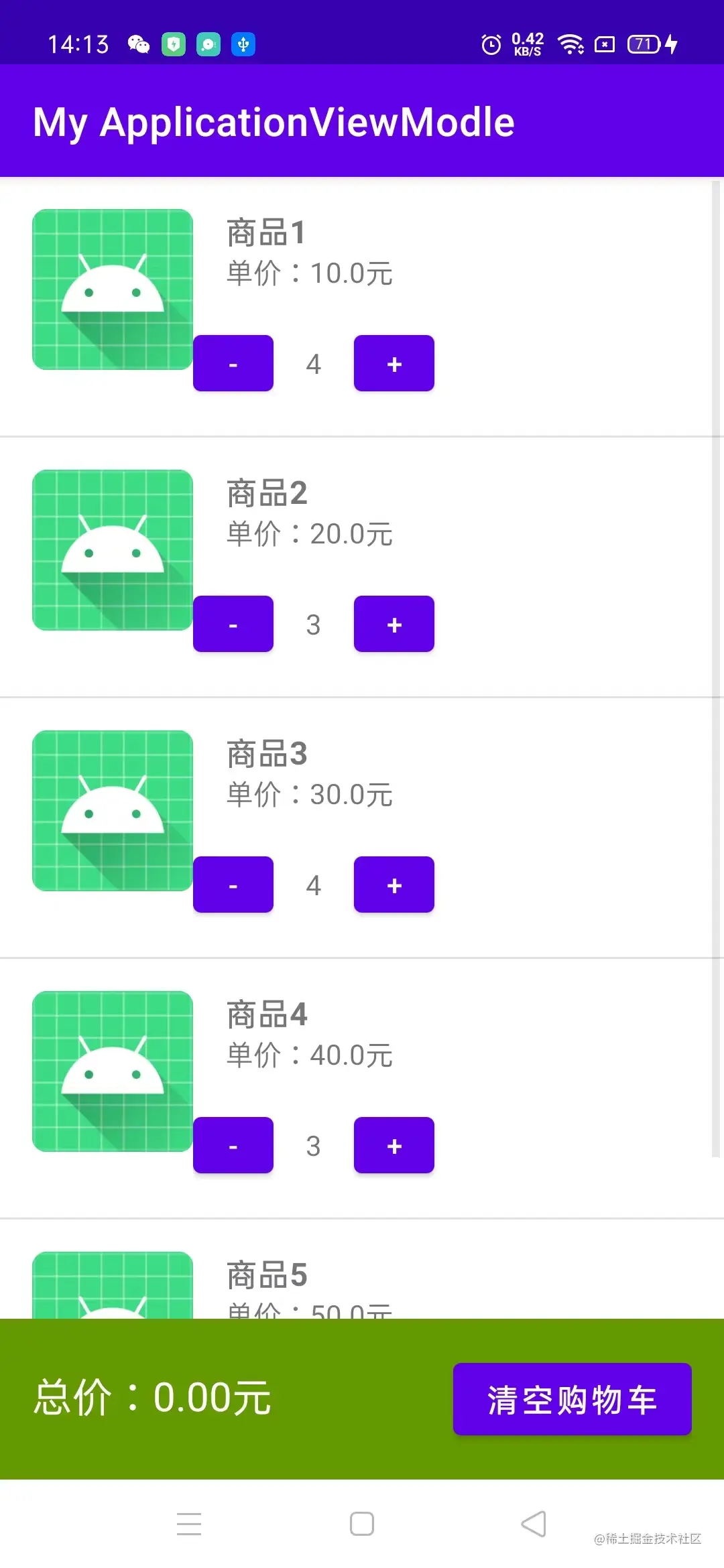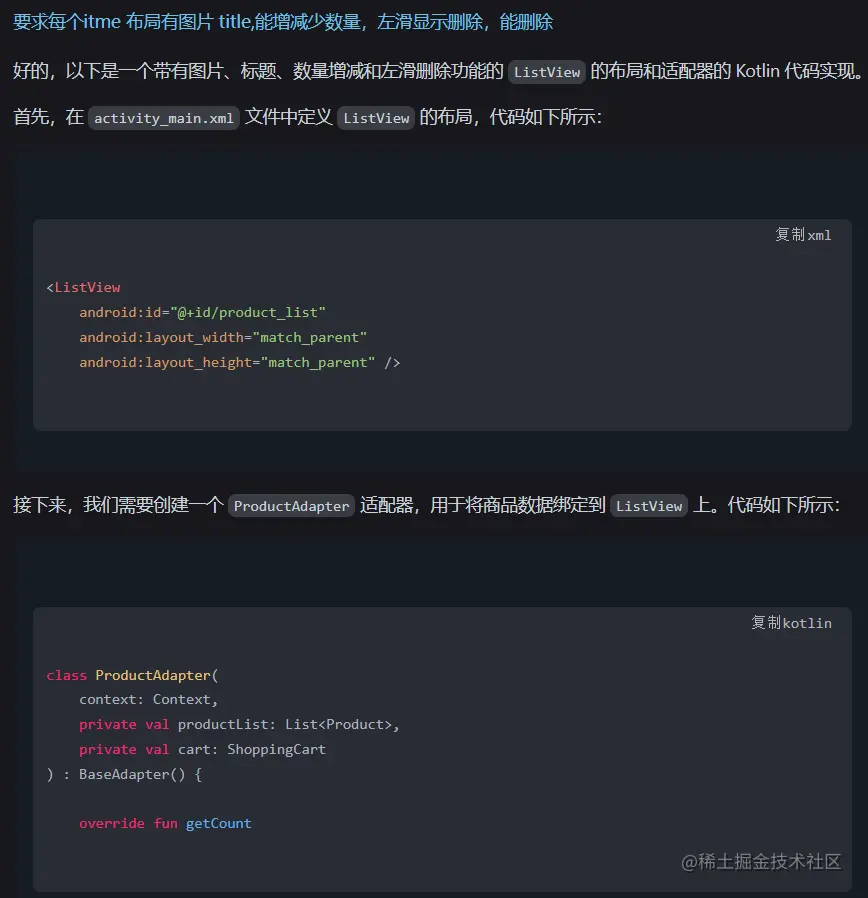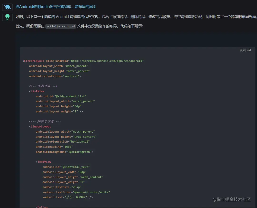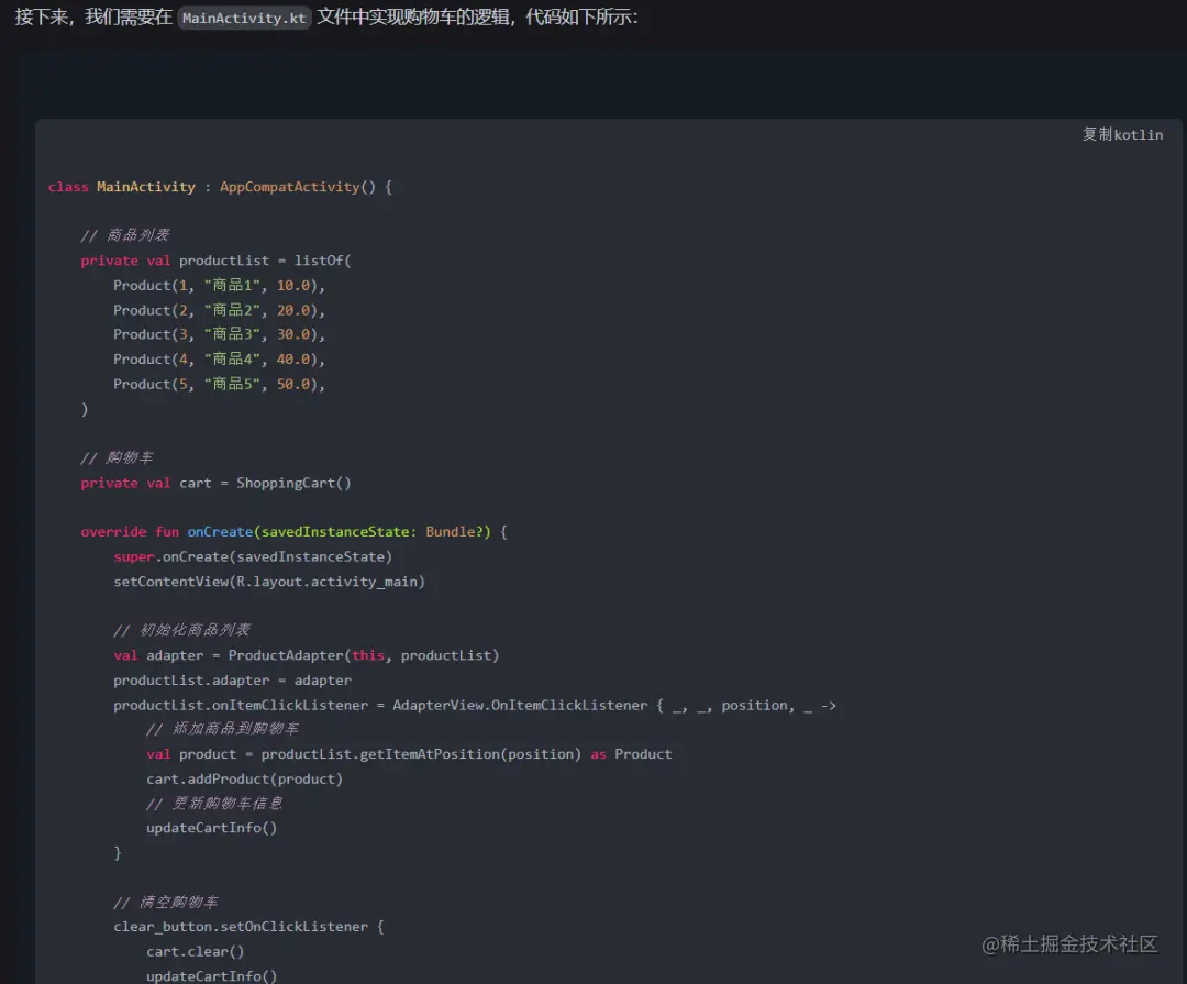 可我还是想看看他还能做什么,于是我打开了我的老本行Android studio 软件,继续让他帮我写代码:(要求他用kotlin帮我写个购物车的界面)