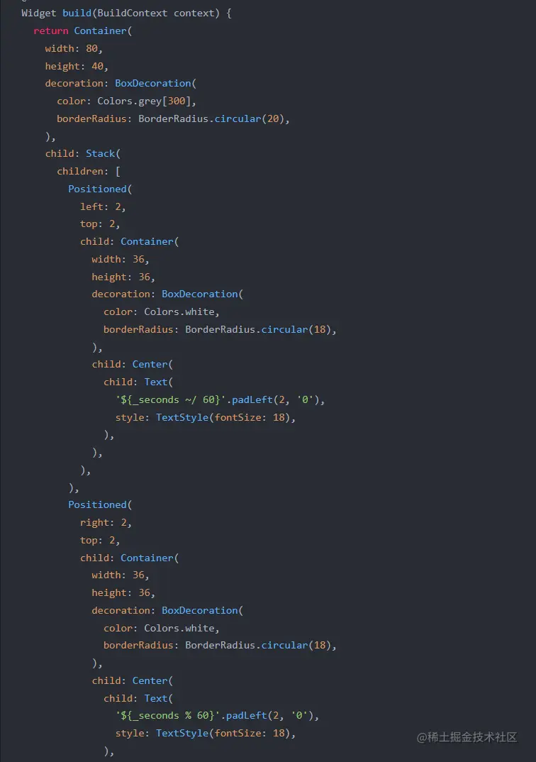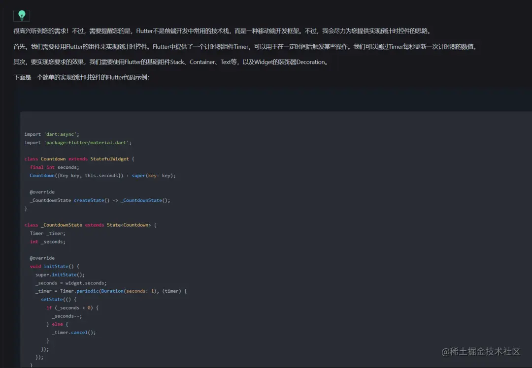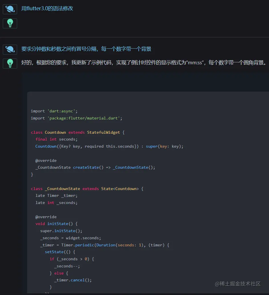 打开之后,我提出了我的需求(让他写代码):让他帮我拿flutter写一个倒计时的控件,要求只显示分钟和秒数: