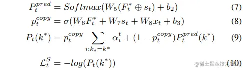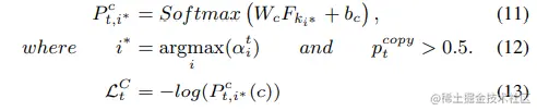 然后,计算固定字典中字符的概率分布,生成一个复制分数作为软开关,在每个时间步t的不同操作之间进行选择: