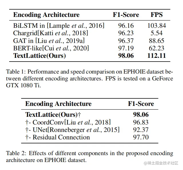 作者首先将本文提出的文档编码方式和之前的主流方法进行对比,比较结果见表1。BiLSTM能很好地感知序列线索,但它不能有效地模拟一维形式的位置空间;GAT可以利用注意机制自适应地融合有用的特征。然而,捕获位置线索的能力很大程度上取决于特征嵌入的方式;BERT-like可以并行进行前向计算,由于加载了预训练的权值,取得了令人满意的性能;Chargrid采用更直接的方式建立输入矩阵,不能保证鲁棒性和效率。值得注意的是,TextLattice(作者的)取得了优越的性能和保持最快的速度,这充分证明了它的效率。比起位置嵌入GAT或BERT-like方法,作者的方法对位置线索的感知更直接和敏感,并确保了比Chargrid更高程度的信息集中度。