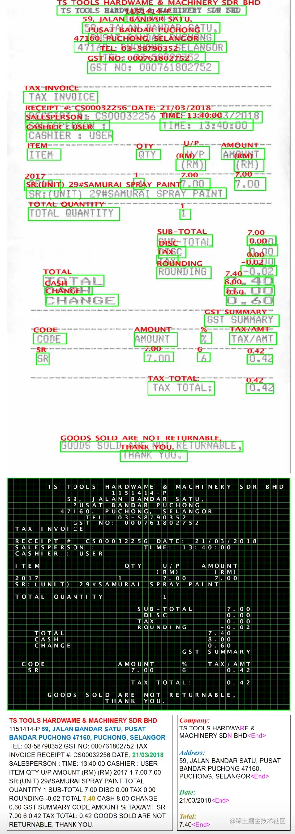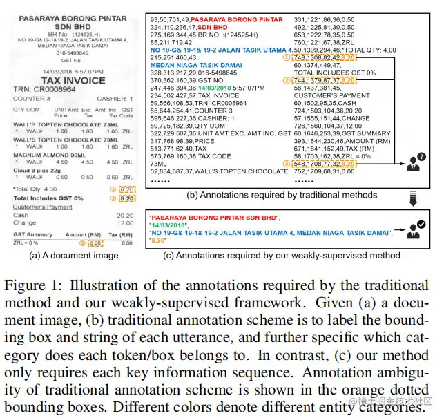 然而,字符级别的类别监督花费了巨大的注释成本,并可能导致标签歧义。给定一个如图1 (a)所示的文档图像,最广泛使用的注释方案是对每个话语的边界框和字符串进行标记,并进一步指出每个字符/框属于哪个类别,如图1 (b).所示这样,需要一个启发式的标签分配过程来训练上述标记模型,其核心思想是将检测到的边框和识别的转录与给定的注释进行匹配,然后为OCR结果的每个字符/边框分配标签。然而,这一过程可能主要会遇到两个方面的问题。首先,错误的识别结果会给匹配操作带来麻烦,特别是对关键信息序列。第二,重复的内容会带来标签的歧义。如图1(a)和(b)所示,三个内容相同的值可以作为关键总量的答案。在大多数情况下,很难建立一个统一的注释规范来确定哪一个应该被视为ground truth。