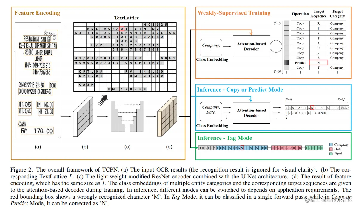 为了解决上述局限性,本文提出了一种端到端弱监督学习框架,该框架可以直接利用目标密钥信息序列来监督解码过程。它带来的好处主要是两方面:一是大大节省了注释成本, 如图1 (c)所示,通过跳过OCR结果与ground truth的匹配,缩短了训练过程;其次,作者的方法通过自动学习OCR结果与ground truth的对齐来解决标签模糊问题,可以自适应地区分重复内容中最可能的结果。 此外,作者还提出了一种灵活的解码器,它与作者的弱监督训练策略相结合,有两种可切换的模式——复制或预测模式(TCPN-CP)和标签模式(TCPN-T),以平衡其有效性和效率。在TCPN-CP中,作者的解码器可以通过从输入中复制一个标记或在每个时间步中预测一个标记来生成关键信息序列,这既可以保留输入中的新内容,也可以纠正OCR错误。在TCPN-T中,解码器可以在一次正向传递中直接将每个字符的表示标记为一个特定的类别,从而保持快速的速度。值得注意的是,作者的解码器只需要训练一次就可以在不同的模式下工作。