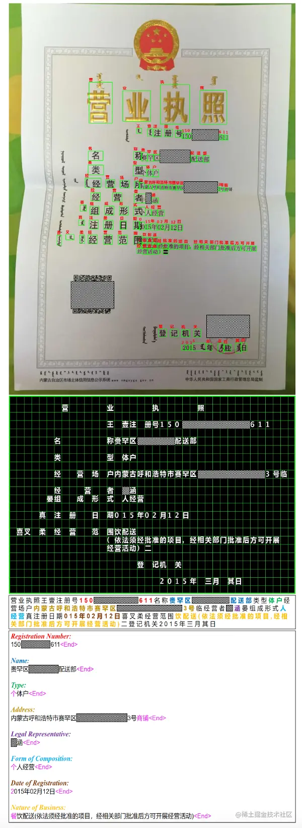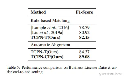 为了进一步探索作者的框架在现实世界的应用程序中的有效性,作者收集了一个内部的营业执照数据集。它包含了2331张由手机或相机拍摄的真实用户需求的照片,而且大部分图像都是倾斜、扭曲或亮度变化剧烈的。作者随机选择1863张图像进行训练,468张图像进行测试,其中有13种实体需要提取。此外,图片是由移动设备产生的,由于图像质量较差,它肯定包含OCR错误。具体结果见表5。作者的端到端弱监督学习框架大大优于传统的基于规则的匹配方法,这也大大降低了标注成本。与TCPN-T相比,TCPN-CP学习到的内隐语义相关性可以通过纠正OCR错误来进一步提高最终性能。一些定性的结果显示在附录中。