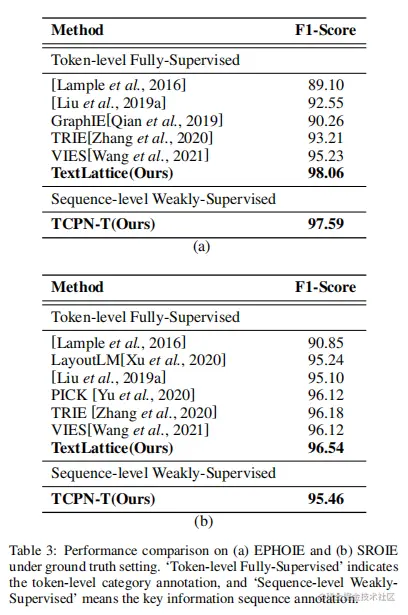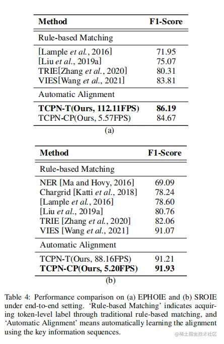 本文也在End-to-End Setting设置下进行了实验,结果如表4。作者的方法在每种模式下都显示了最先进的新性能。可以推断,选择TCPN-CP或TCPN-T模式的一个重要基础是语义和相应语料库的丰富性。在SROIE上,TCPN-CP的性能明显优于TCPN-T,这主要有利于纠错能力;然而,在EPHOIE上,尽管两种模式都优于TCPN-CP的TCPN-CP,主要原因应该是中文字符的多样性和由此导致的语料库的缺乏。