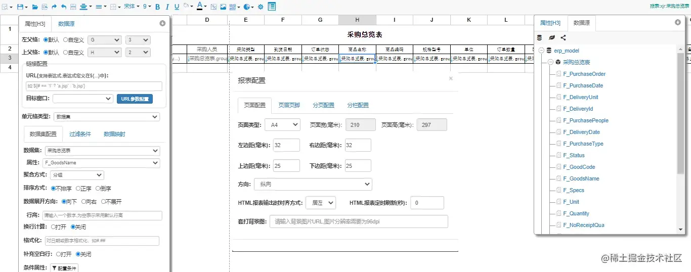 设计器支持类excel电子表格功能设计,可大大缩短制作时间。不同点在于Excel是对单个数据操作,这里是对数据字段操作,将需要的数据字段拖到表格中,再配以各种可视化的属性设置。