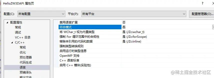 工程属性 – c/c++ – 语言 – 符合模式 设为 否