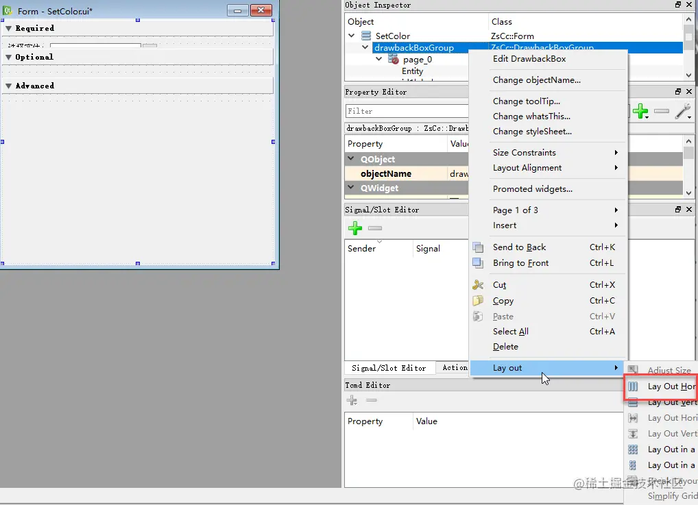 这里与文档所述不太一样,不能只选中自己添加的控件进行 Layout,而是要跟 GroupBox 编在一起。