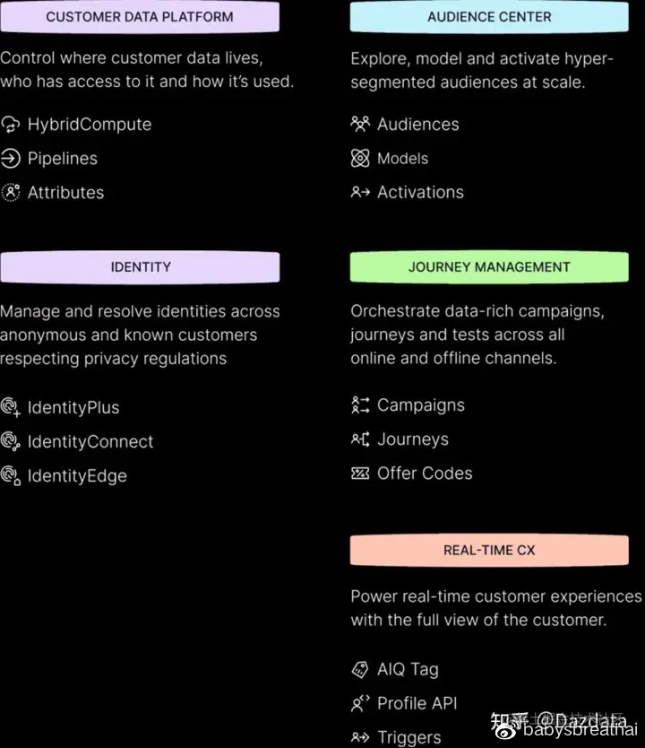 ActionIQ主要从:360度客户数据中心、客户身份解析、细分受众、营销活动编排、实时客户体验、个性化营销等六个方面进行构建。