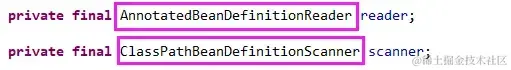 AnnotatedBeanDefinitionReader和ClassPathBeanDefinitionScanner来负责注册类和扫描包,如下图: