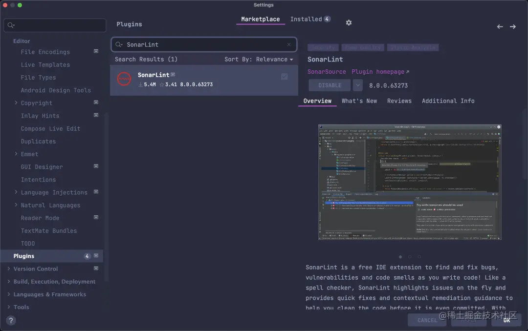 可以直接打开 IDEA 设置 -> Plugins,在 MarketPlace中搜索SonarLint,直接安装就可以。