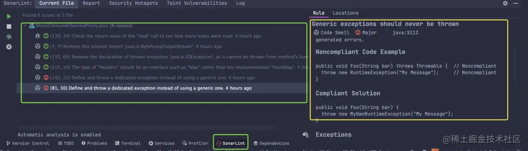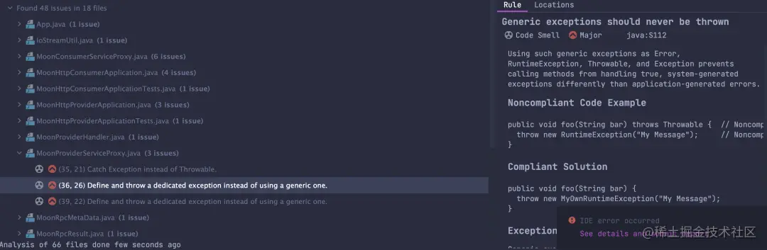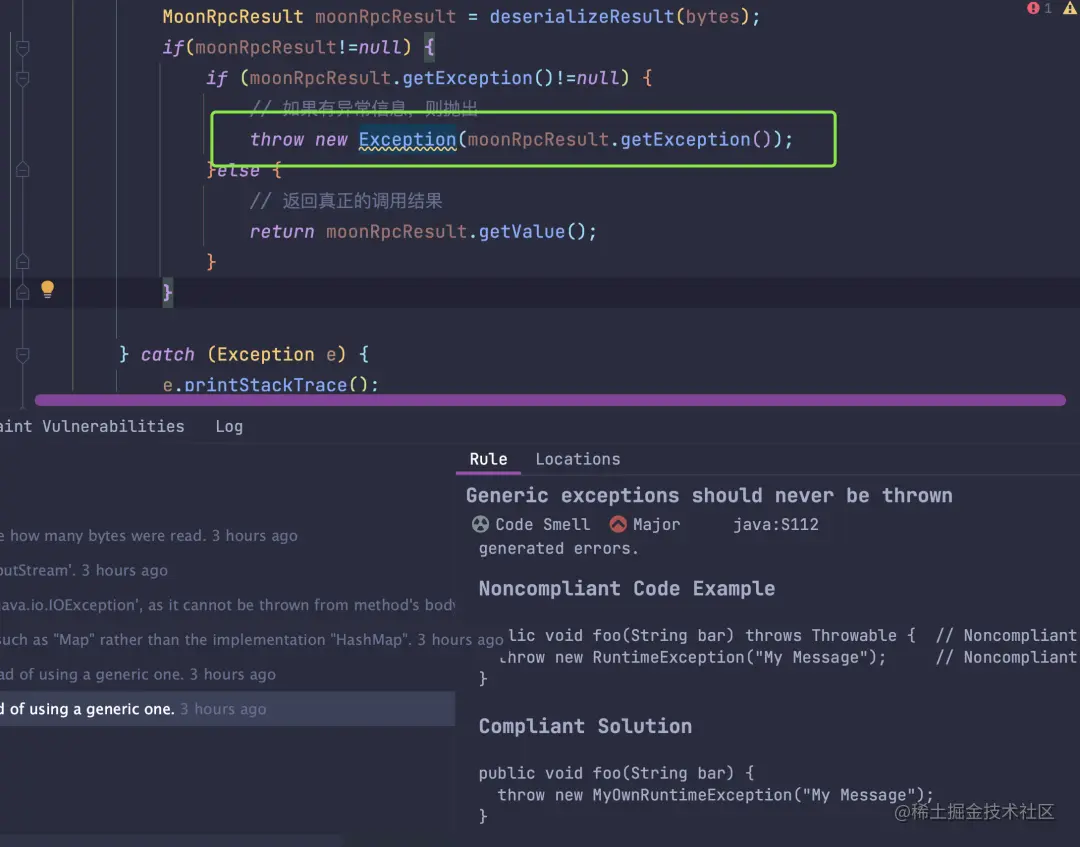 例如下面的异常抛出方式,直接抛出了 Exception,然后 SonarLint 建议不要使用 Exception,而是自定义一个异常,自定义的异常可能让人直观的看出这个异常是干什么的,而不是 Exception基本类型导出传递。