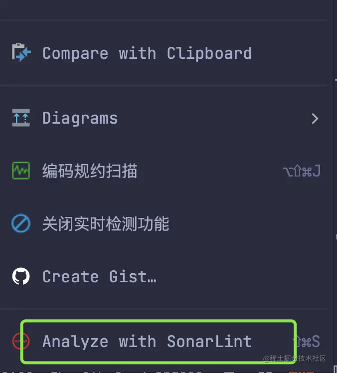 当然你也可以在某一文件中点击右键,也可在项目根目录点击右键,在弹出菜单中点击Analyze with SonarLint,对当前文件或整个项目进行分析。