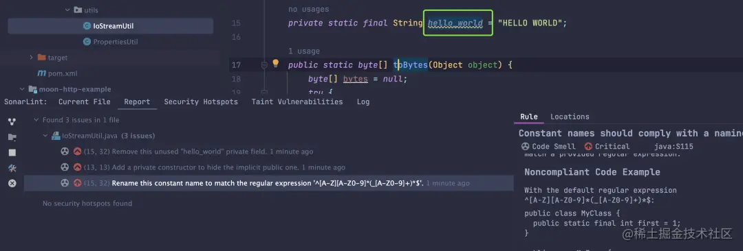 例如下面这个名称为 hello_world的静态 final变量,SonarLint 给出了两项建议。