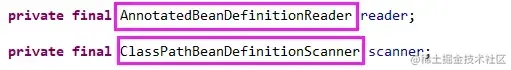 AnnotatedBeanDefinitionReader和ClassPathBeanDefinitionScanner来负责注册类和扫描包,如下图: