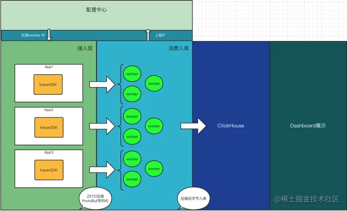 worker:每个模块会分配数量不等的worker机器,启动后上报自己的IP地址到配置中心。接受到客户端发来的日志后,解析相应的字段,批量写入clickhouse数据库。
