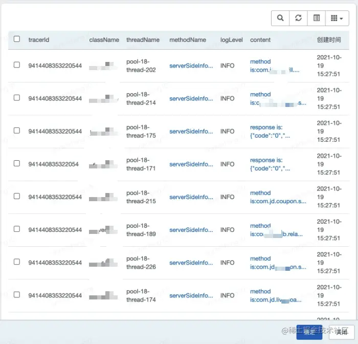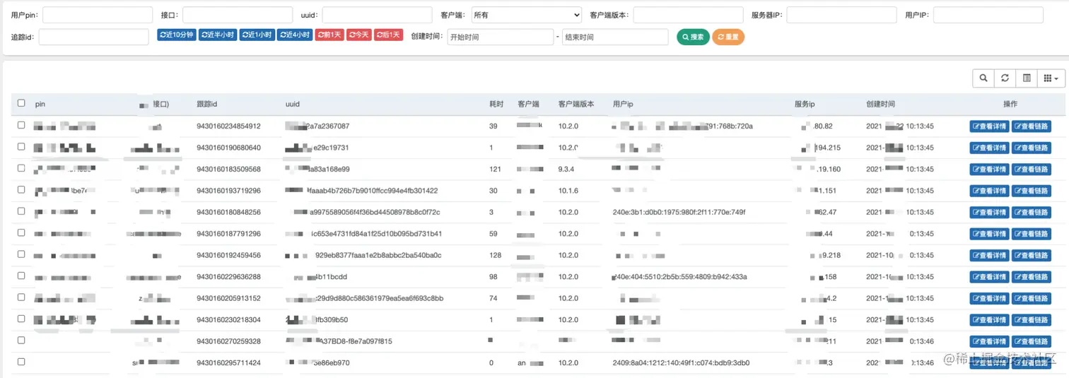 下图界面展示的即为一些索引项,点击查看详情,则从数据库捞出压缩过的数据,此时才解压并展示给前端。查看链路,则是该次请求中,整个链路用户打印的log(包括线程池内的)。