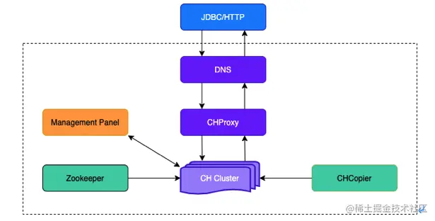 EasyOLAP部署CH集群是三层结构:域名 + CHProxy + CH节点,域名转发请求到CHProxy,再由CHProxy根据集群节点状态来转发。CHProxy的引入是为了让Query均匀分布在每个节点上,,并对CHProxy做了一定的改进,自动感知集群节点的状态变化。