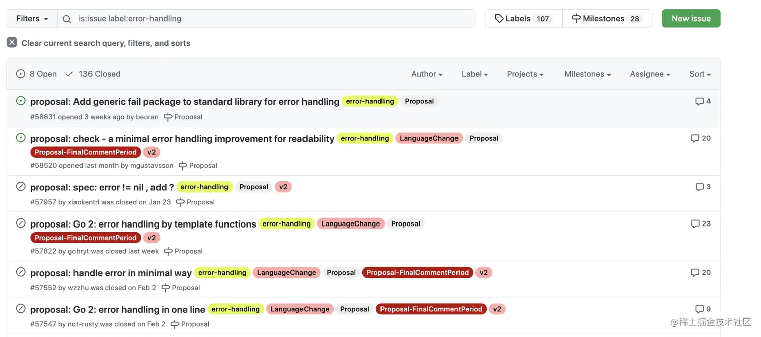 当然,这个合集并不 100% 全面,如果需要全查看一遍,可以自行在 go/issues 库搜索 error-handling 标签就可以了。