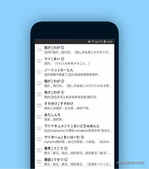 这是一个电子词典的APP,专门用来查日语的。软件的界面超简单,只有一个输入框,直接输入中文就能查到对应的日文,还有扩展的单词和注释。它还支持模糊搜索,一些不大清楚含义的单词也能用它查到。