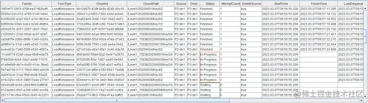 Status字段为 In-Progress 的任务数目表示控制节点发起任务时的并发度,通过 dfsRebalanceConcurrency 参数配置,默认为数据节点个数的两倍。recoveryWorkers 参数表示数据节点执行任务时的并发度,默认为数据节点个数的两倍。