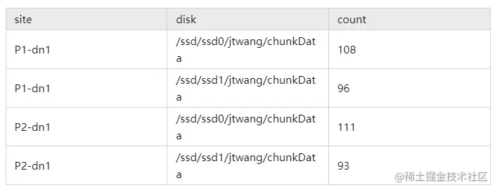 同样地,在数据节点上执行以下命令,对于 P2-dn1 数据节点上各块磁盘之间进行分区再平衡。