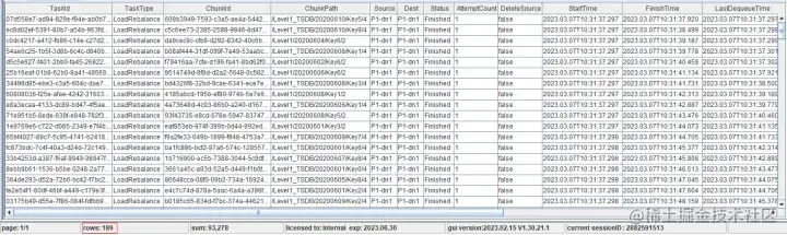 从图中看,两次再平衡共计迁移189个分区。可以看到,DeleteSource 字段全部为 False,原因为对于数据节点内部分区迁移,从旧盘到新盘,分区仍然是在同一个数据节点,所以该参数一直为 False。