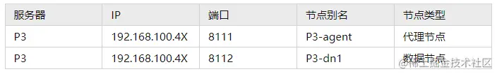 增加一台服务器,名称为 P3,部署一个代理节点、一个数据节点,如表所示。